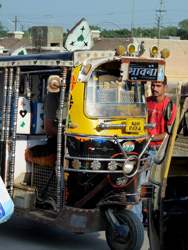 The two small villages (population of ~300) we stopped at on the way to the desert were quite clean and picturesque. The first village was half Hindu and half Muslim. While they all get along well, they settle down only on the side of the village where their community stays. There was an imaginary line. All houses were built using cow dung, mud and water and then the wall were painted and decorated. There was a lot of cow dung drying in piles all around, it is also used as fuel. Families are big and there is not enough space for everyone to sleep inside, so they put blankets on platforms outside and kids sleep there. For Diwali they had a celebration where visitors from other villages came, they cooked a couple of goats and ate them all together. Each village had a school and a doctor. Only men work and women take care of kids and households. As one old uncle was telling us: "All they do is bring water and make chapatis. Foreign women work, it's better for the men there..." :o) Well, I am sure that these women work hard as well, it's not an easy life.